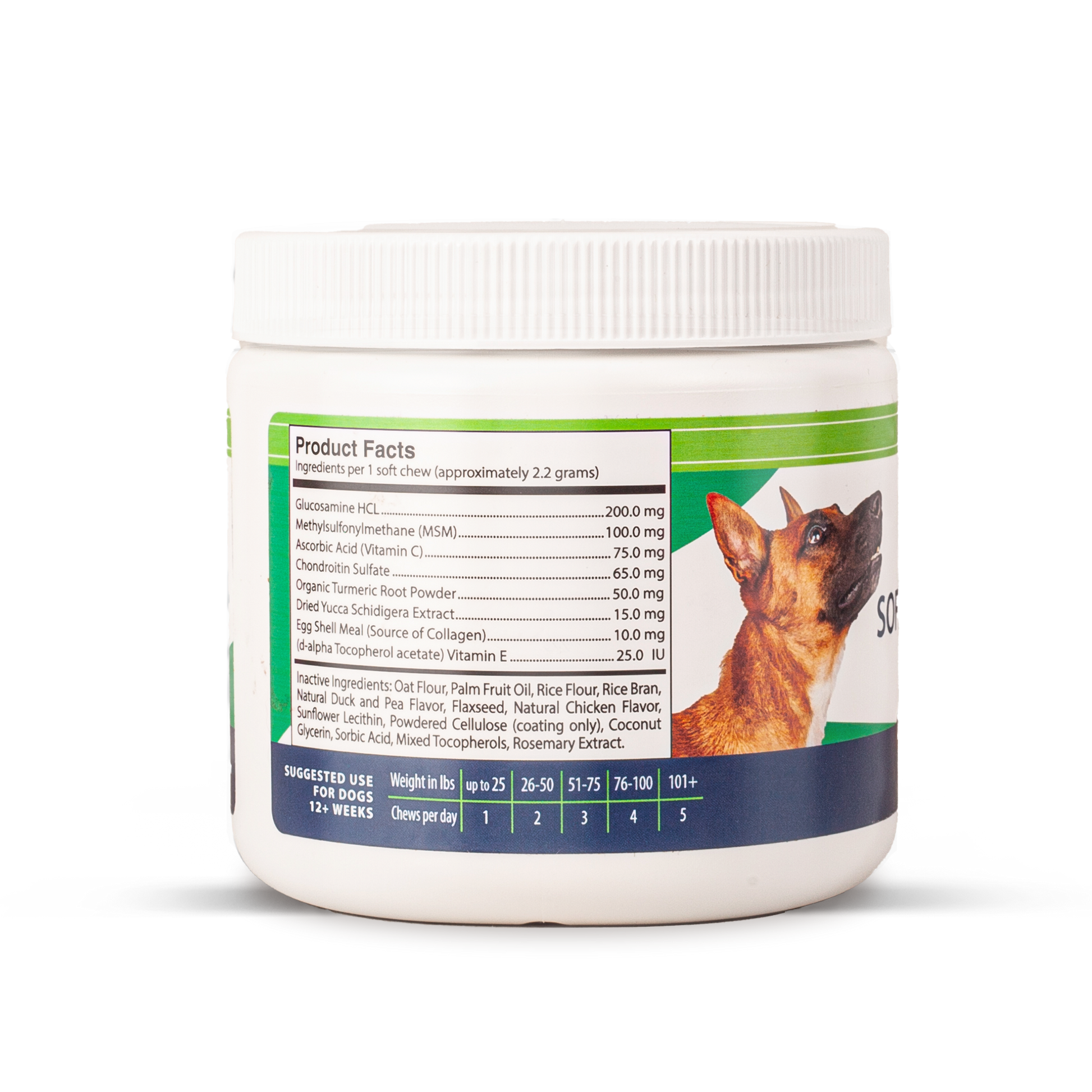 Our comprehensive soft chew supplement is not just a treat; it's a proactive approach to your furry companion's joint health. If your pup experiences joint discomfort or stiffness, our treats provide a source of reliable relief. Glucosamine supports cartilage health while MSM reduces existing inflammation providing reliable relief from joint stiffness and discomfort. The combined effects of Glucosamine and MSM work together to alleviate inflammation and soothe joints, which help your dog move with greater ease.